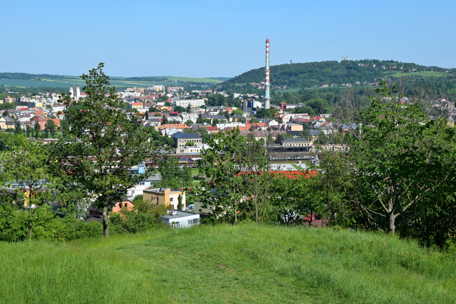 Poté jsme už z asfaltu zamířili do kopců, které se z údolí zvedají. V táhlém stoupání se nejeden větrač zpotil, někteří už měli od sluníčka i pořádně rudé krky. Pozornost těch, kteří koukali do mapy, upoutala Jelení studánka poblíž cesty, nikdo ale neminul ceduli informující o tom, že se v lese zabydlel kůrovec, anebo tabule naučné stezky informující o zdejším lesním životě. To už ale byli nablízku vyhlídce na Bezručově vrchu, kam se ale paradoxně pozvolna klesá. I tak jsme si ale mohli od zdejšího památníku užít pěkného pohledu na Krnov, vrch Cvilín s poutním kostelem a rozhlednou a okolí.