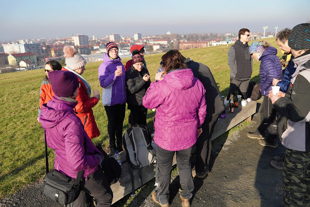 V ulicích Hradiště nás mlha nijak zvlášť nezlobila, ale mráz byl dost vlezlý. Než jsme se vydali na naplánovanou trasu, někteří si krátce prošli historické centrum města, jiní vzali zavděk teplem kavárny a ranní kávy. Když jsme se pak potkali u betléma pod vánočním stromem, nabrali jsme (kolem kaple sv. Šebestiána, na které se prý trénoval přesun stavby před slavným transferem kostele v Mostě, a kolem kina Hvězda, které bývá centrem Letní filmové školy) směr Černá hora a park Rochus, který se na jejích svazích rozkládá. Ještě před více než dvaceti lety tu bylo vojenské cvičiště, na což jeden z větračů sloužící kdysi právě v Hradišti vzpomenul, zároveň koukal, jak se lokalita proměnila. Tedy koukali jsme všichni.